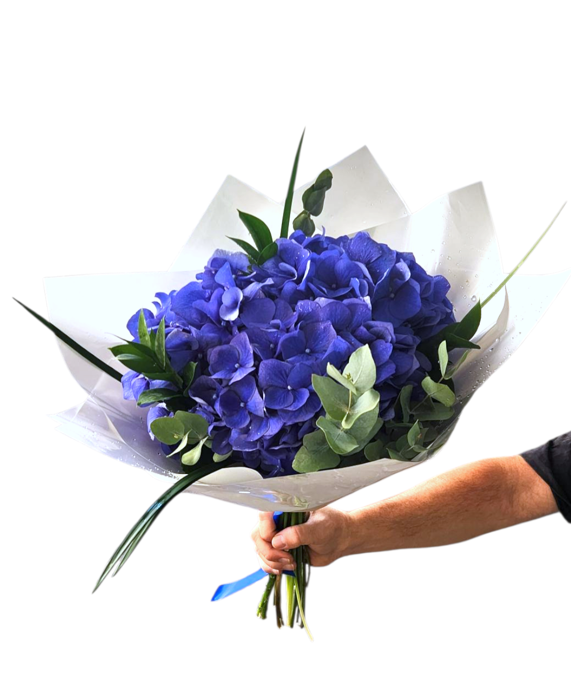זר הורטנזיה יוקרתי ומשגע ביופיו, בשילוב ירק ועטיפה הולנדית להשלמת המראה היוקרתי.