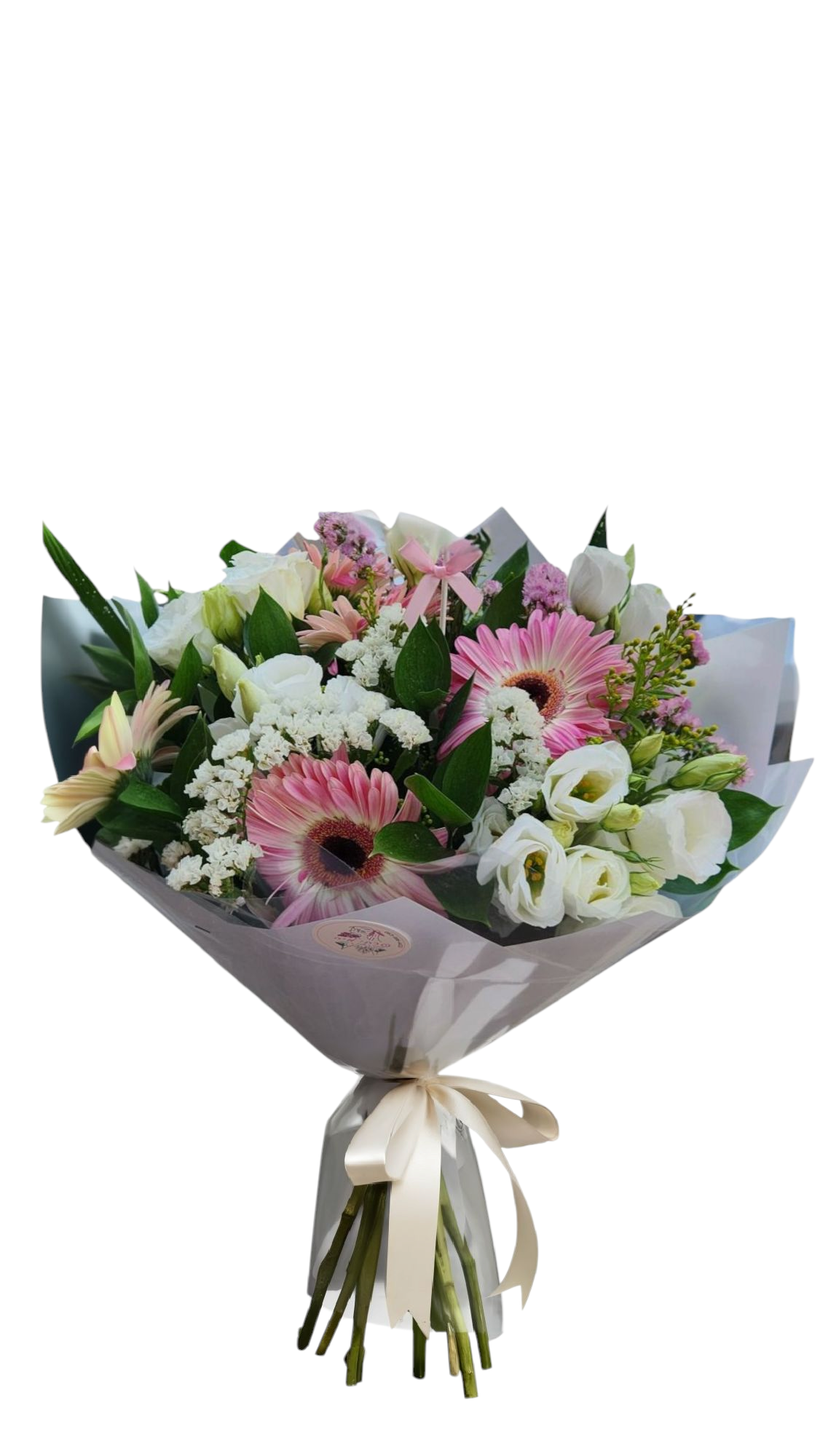 זר עדין ואביבי של ליזיאנטוס וגרברה, בשילוב פילרים וירק מתאימים.