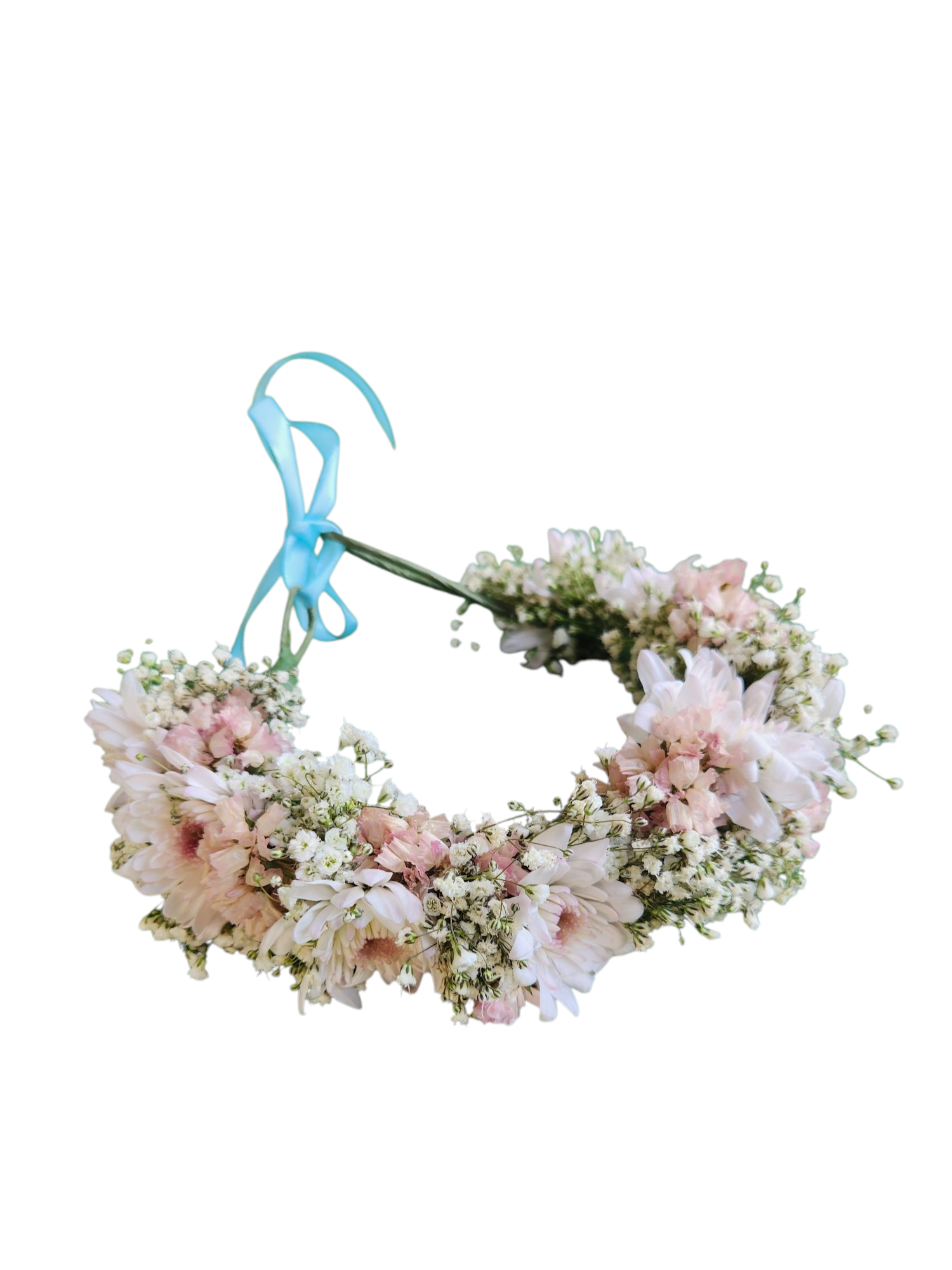 זר חגיגי ליום הולדת בשילוב חרציות וגיבסניות,בצבעים רכים.